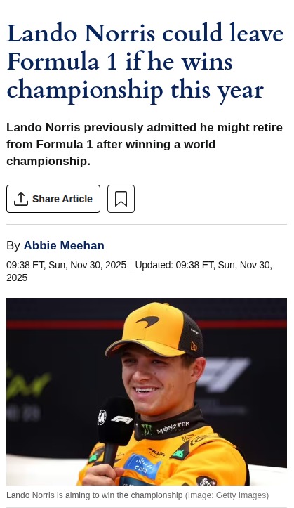 Kyle Bennett+FollowNorris Eyes F1 Glory—Then a Shock Exit?Is history about to repeat itself in Formula 1? Lando Norris, McLaren’s rising star, could pull a Rosberg and walk away if he wins the championship in Qatar. After a tough break in Vegas with that DQ, Norris still leads the standings and hints he might retire at the top—just like Nico did after his epic 2016 title. Would you want to see Lando go out on a high, or keep racing? #Sports #Racing #F100Share