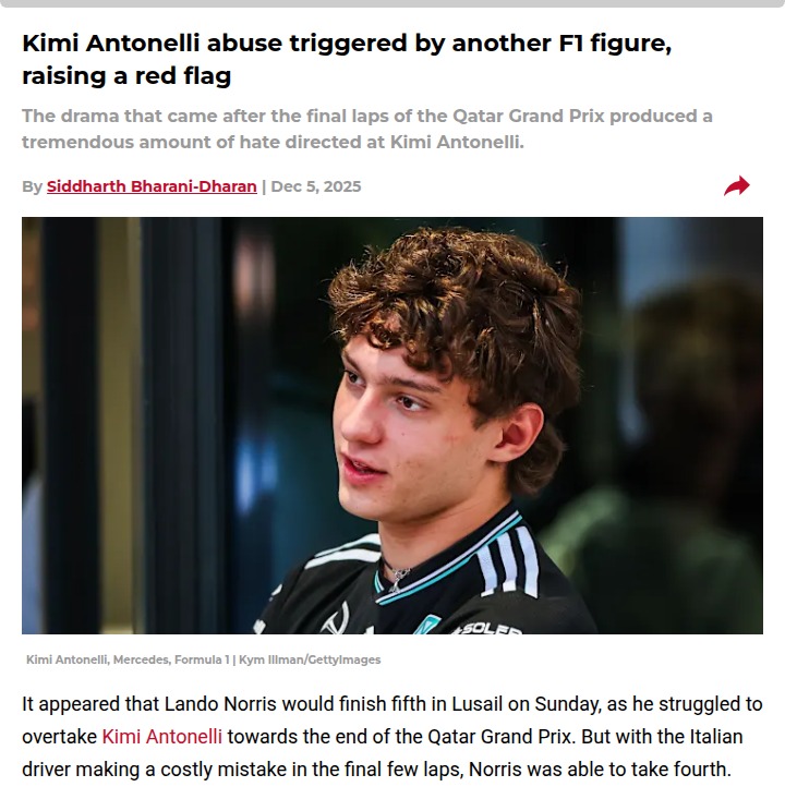 lisa79+FollowF1: Antonelli Error Sparks Norris-Verstappen DramaWow, what a wild finish in Lusail! Kimi Antonelli’s late mistake let Lando “Last Lap Lando” Norris snatch P4, giving him a crucial 12-point lead over Mad Max Verstappen heading into the season finale. But the real controversy? The online abuse Antonelli faced, especially after Red Bull’s Helmut Marko jumped the gun with harsh criticism. The FIA really needs to step up and protect drivers from this kind of treatment, both from fans and paddock insiders. Thoughts on how they should handle it? #Sports #Racing #F110Share