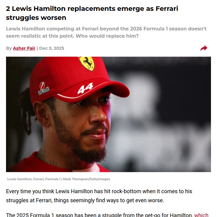 Karla Young+FollowWho Replaces King Lewis at Ferrari?Ferrari’s dream with King Lewis is turning into a nightmare. Q1 exits are now the norm, and Hamilton looks more checked out than ever as the 2025 season wraps up. With his $446M contract ending in 2026 and no signs of a turnaround, the Scuderia is already eyeing replacements. Ollie Bearman, the Ferrari Academy prodigy, and F2 champ Gabriel Bortoleto are the hot names. Could both rookies be Ferrari’s future if Leclerc also jumps ship? #Sports #Racing #F110Share