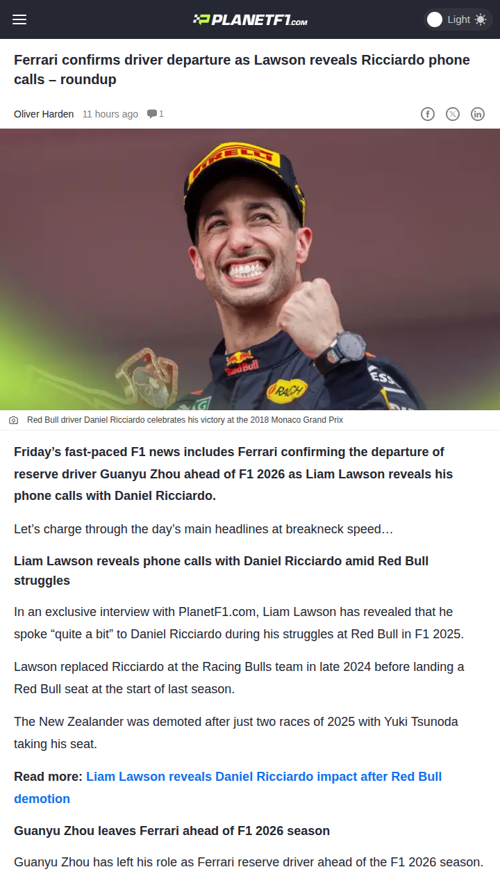 romankimberly+FollowLawson Spills on Ricciardo Red Bull DramaF1 fans, did you catch Liam Lawson’s latest interview? The Kiwi opened up about his behind-the-scenes chats with the Honey Badger, Daniel Ricciardo, during those tough Red Bull days. Lawson’s brief stint replacing Ricciardo at Racing Bulls and his quick demotion in 2025 is still a hot topic. The Red Bull driver shuffle just keeps the rivalry and drama alive! Thoughts on who should get the next shot? #Sports #Racing #F110Share