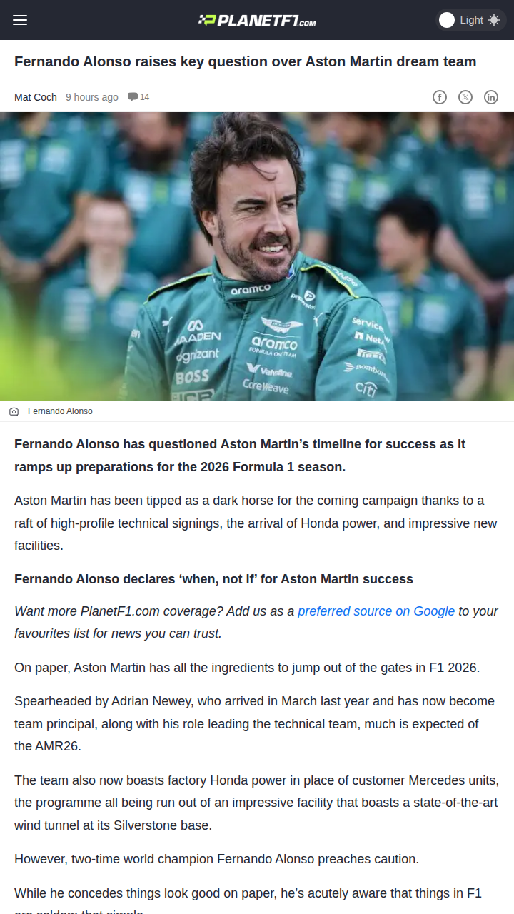 qglover+FollowAlonso Questions Aston Martin’s 2026 HypeEl Nano is keeping it real about Aston Martin’s so-called ‘dream team’ for 2026. Despite all the buzz—Newey at the helm, Honda power, and a shiny new wind tunnel—Alonso’s asking the tough question: can all these big changes really come together in just a few months? He’s confident the team will win, but the real debate is when. Is the hype justified, or are we in for a longer wait? #Sports #Racing #F100Share