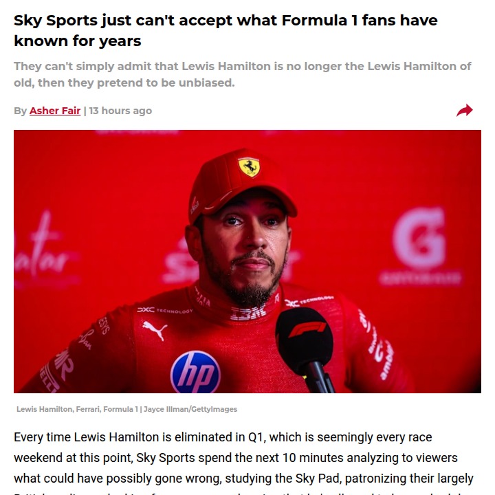 jennifer23+FollowIs Hamilton Still the GOAT or Just 'Mid' Now?Let’s talk about Sir Lewis. Every time he gets knocked out in Q1, Sky Sports spends ages on the Sky Pad, making excuses for the seven-time champ. But is it time to admit King Lewis just isn’t the force he once was? Leclerc’s racking up podiums, Russell’s outpacing him, and Ferrari doesn’t look like the fairytale ending. Is Sky Sports protecting their national hero, or are fans right that Hamilton’s past his prime? #Sports #Racing #F130Share