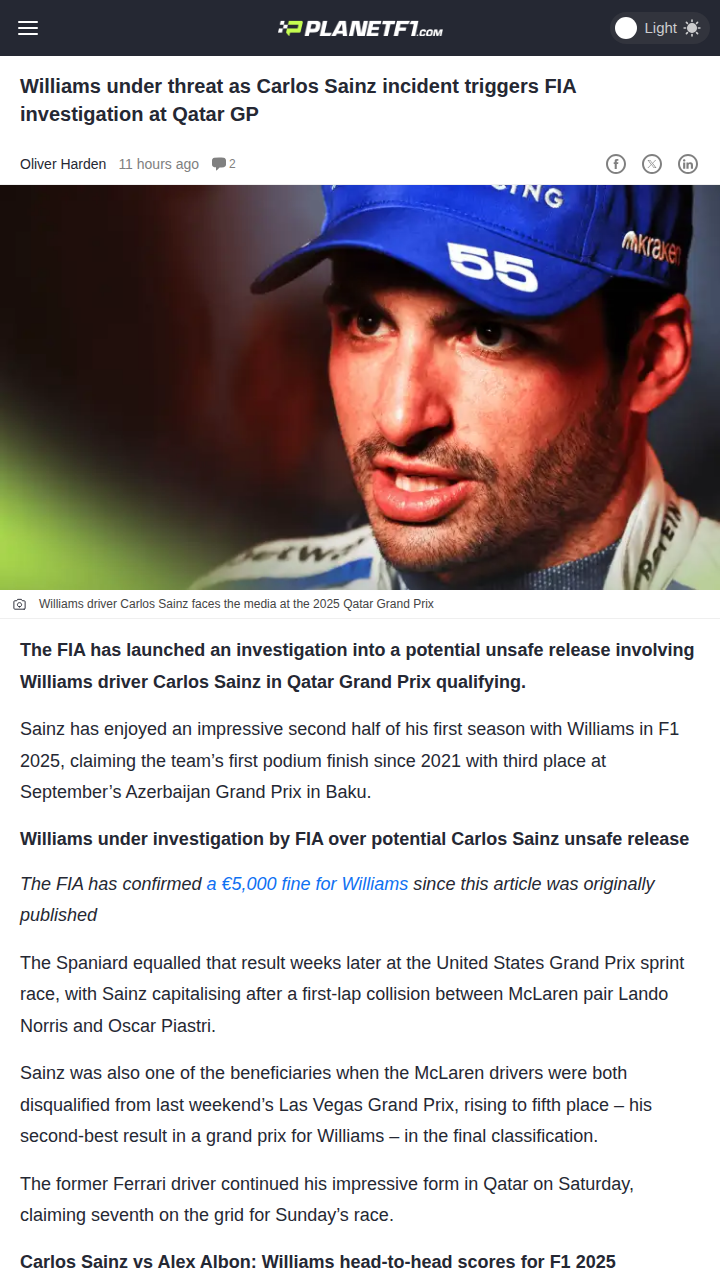 jennifer23+FollowWilliams Under Fire After Sainz Qatar GP DramaWow, Williams fans—what a wild qualifying in Qatar! The FIA has hit the team with a €5,000 fine after a potential unsafe release involving Smooth Operator Carlos Sainz in Q3. Sainz has been on fire lately, bagging podiums and outshining teammate Albon, but this pit lane controversy could shake things up. Do you think the penalty was fair, or did the stewards overreact? Let’s hear your takes! #Sports #Racing #F111Share