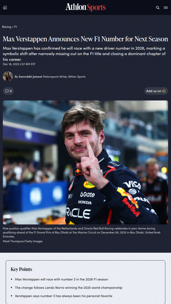 Jeremy Campbell+FollowMad Max’s Fresh Start: New Number, New EraBig news from the F1 paddock: Mad Max is officially switching up his digits for 2026! With Lando Norris taking the crown and the #1 plate, Verstappen is leaving his iconic #33 behind and going with #3—a number he’s always loved. No rivalry drama here, just a personal choice as the Red Bull ace gears up for F1’s next chapter. After that nail-biter finish last season, do you think this new number brings Verstappen fresh luck? #Sports #Racing #F100Share