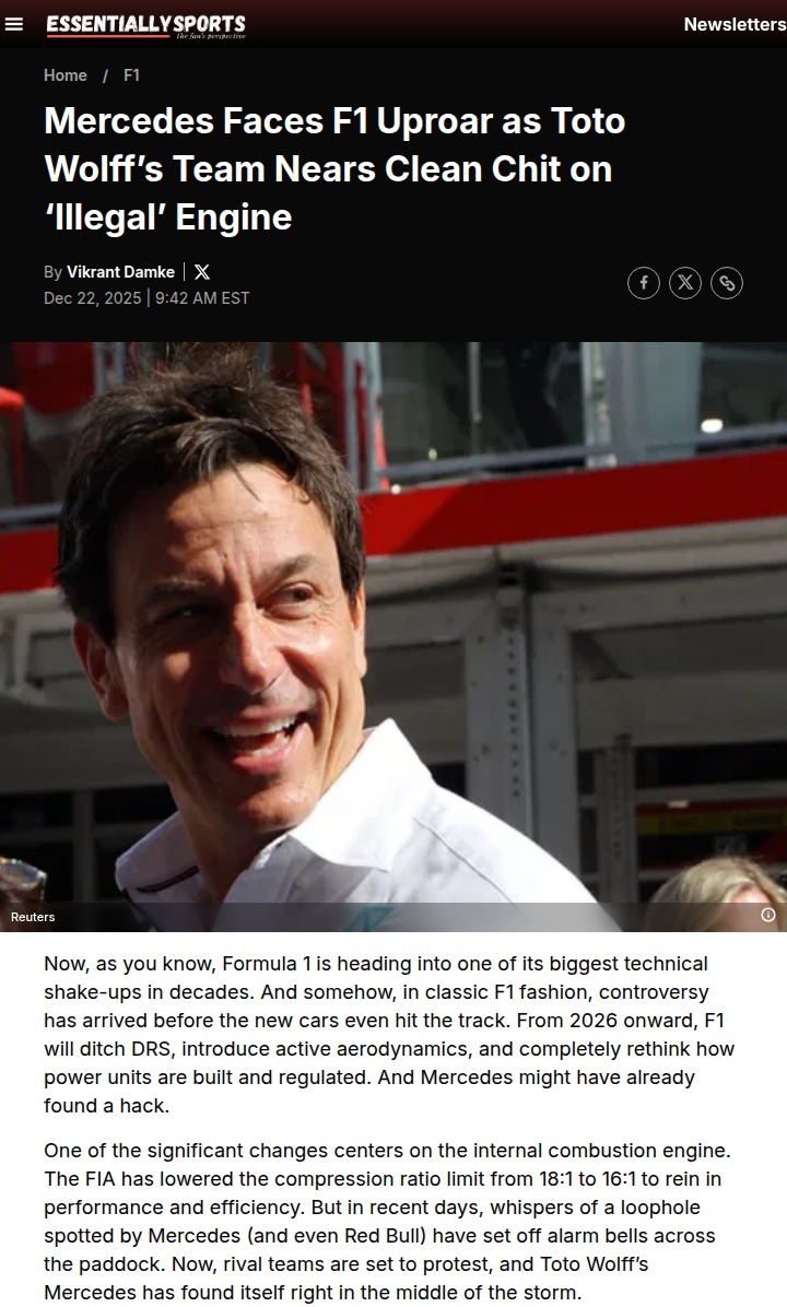 Jeremy Campbell+FollowMercedes vs Red Bull: F1 Engine War Heats UpLooks like the Silver Arrows and the Bulls are at it again! With the 2026 rule reset looming, Mercedes and Red Bull are locked in a heated debate over the new engine compression rules. Word in the paddock is both teams may have found a clever way to skirt the 16:1 cap, possibly regaining lost horsepower. If the FIA cracks down, it could shake up the whole grid before the lights even go out in Australia. Thoughts on who’s playing it smarter? #Sports #Racing #F120Share