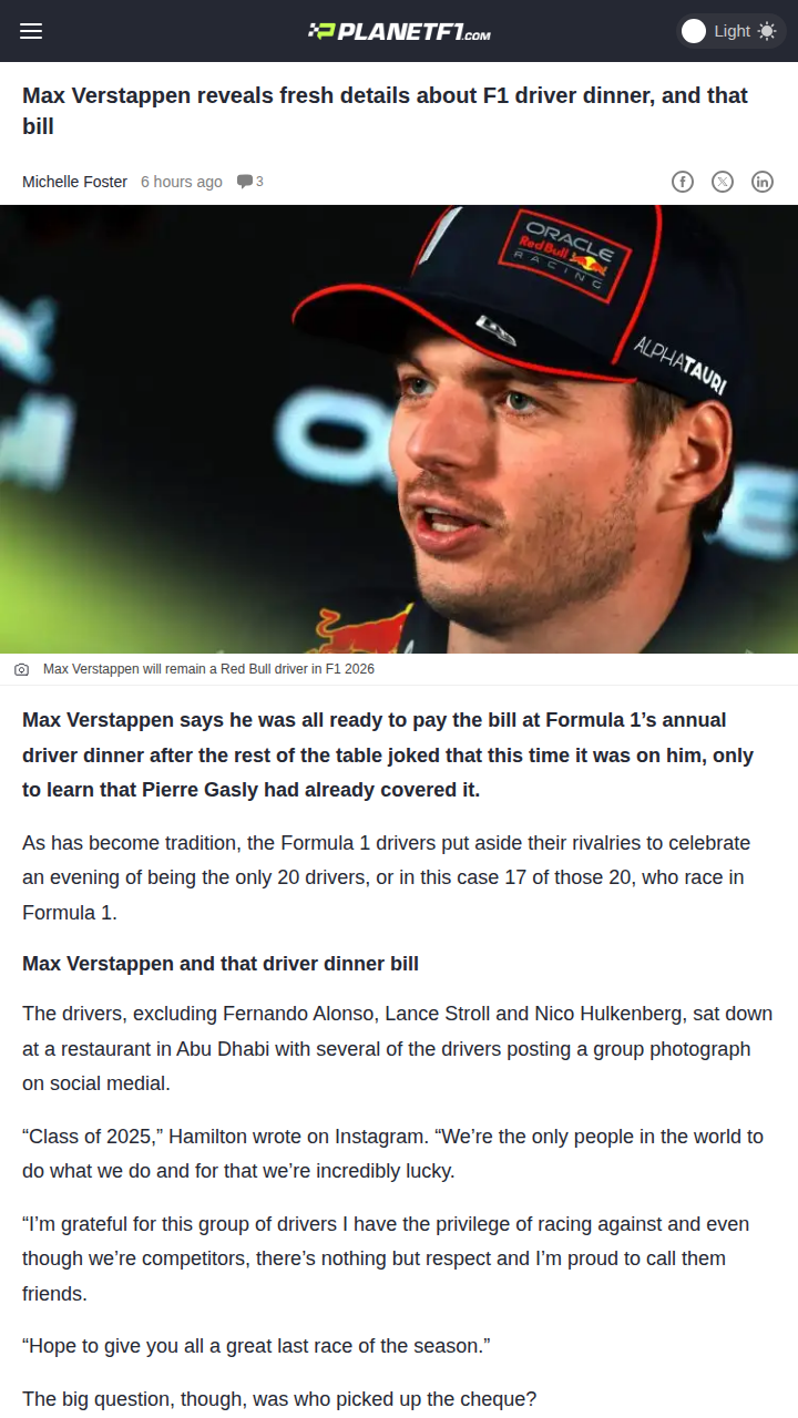 qglover+FollowWho Really Paid for the F1 Driver Dinner?So, the annual F1 driver dinner in Abu Dhabi turned into a bit of a who’s-got-the-bill showdown! Everyone joked it was on Super Max this year, but turns out Pierre Gasly quietly covered the whole thing before Max could even reach for his wallet. Love seeing these fierce rivals drop the gloves for a night and just enjoy being the only 20 in the world who do what they do. Respect all around! #Sports #Racing #F120Share