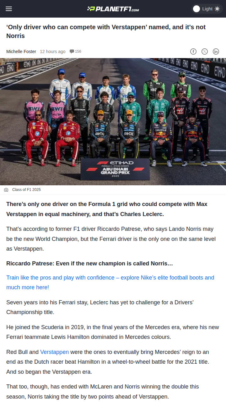 Isabel Collier+FollowIs Carletto the Only True Verstappen Rival?Patrese just dropped a hot take: even with Norris as the new champ, he says Carletto (Leclerc) is the only one who could really go wheel-to-wheel with Super Max in equal cars. Seven years at Ferrari and still no title shot for Leclerc—Patrese blames the car, not the driver. Do you agree Leclerc’s the only real threat to Verstappen, or is Norris now in that league? Let’s hear your takes! #Sports #Racing #F120Share