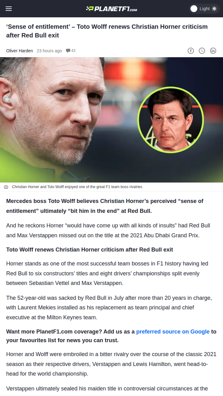 Karla Young+FollowWolff: Horner’s Entitlement Cost Him Red BullToto Wolff just reignited the classic Mercedes-Red Bull rivalry, calling out Christian Horner’s “sense of entitlement” after his Red Bull exit. Wolff claims Horner never admitted the 2021 Abu Dhabi finale was handled poorly, and says if Mad Max had lost, Horner would’ve gone ballistic. With Horner out and rumors swirling about his next move, is this the end of an era or just another twist in F1’s wildest rivalry? #Sports #Racing #F110Share