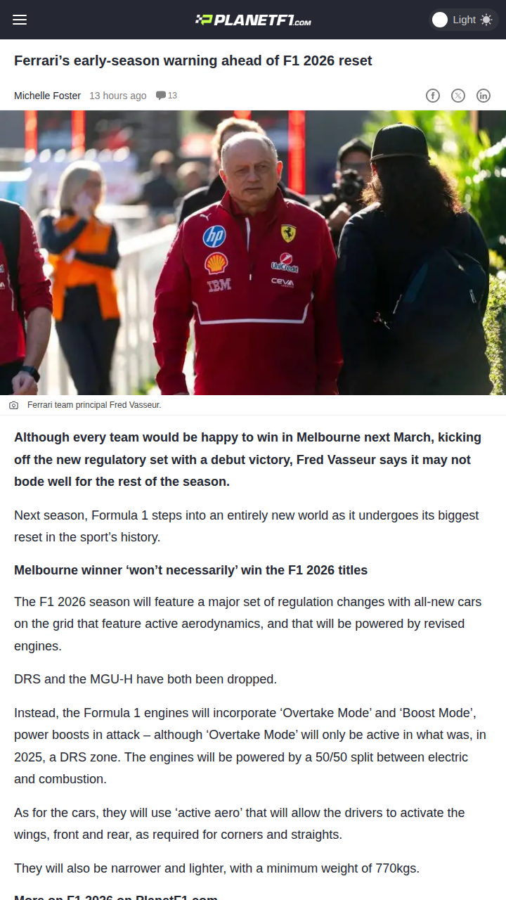 Roger Franco+FollowFerrari’s 2026 Gamble: Early Wins or Long Game?Tifosi, what do you make of Fred Vasseur’s warning ahead of the F1 2026 reset? While everyone dreams of a Melbourne win, the Prancing Horse boss says blowing the budget early on upgrades could backfire as the season goes on. With active aero, new engines, and ‘Boost Mode’ coming, it’s anyone’s guess who’ll have the edge. Is Ferrari playing it smart, or should they go all-in from race one? #Sports #Racing #F100Share