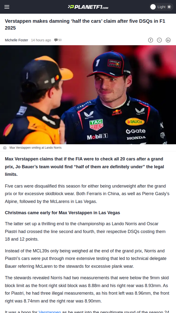 qglover+FollowVerstappen: FIA Checks Would DQ Half the GridMad Max just dropped a bombshell after the McLaren double DSQ in Vegas, saying if Jo Bauer’s FIA crew checked every car, “half of them are definitely under” the legal limits. The random checks this season already caught out both Ferraris in China and McLaren’s Norris and Piastri in Vegas, shaking up the title race. Should the FIA test all 20 cars, or is the randomness part of the game? Sound off, F1 fam! #Sports #Racing #F130Share