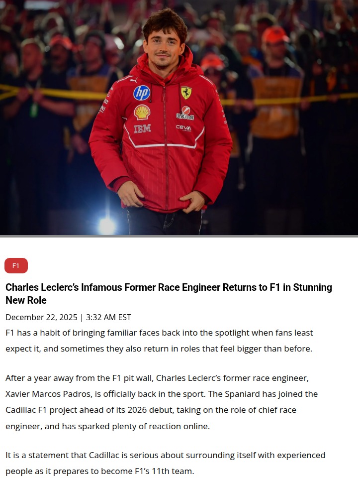 jennifer23+FollowLeclerc’s Ex-Engineer Joins Cadillac F1!Xavi Marcos Padros, the man behind the radio during some of Charles Leclerc’s most dramatic Ferrari moments (remember Monaco 2022?), is back in F1—this time as Cadillac’s chief race engineer for their 2026 debut. After a rocky Ferrari chapter, fans are buzzing: will Xavi thrive away from the Scuderia’s chaos? Cadillac’s move signals they’re serious about building a powerhouse team from the ground up. Thoughts on this fresh start for Xavi and Cadillac’s F1 ambitions? #Sports #Racing #F110Share