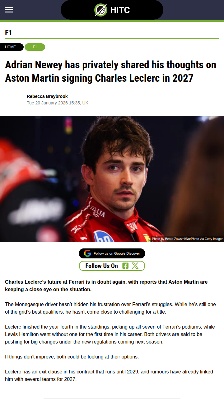 romankimberly+FollowLeclerc to Aston? Newey’s Big Bet for 2027Rumors are heating up about Charles Leclerc possibly jumping ship from Ferrari to Aston Martin in 2027, especially with Adrian Newey set to take the reins. The buzz is that Newey sees Leclerc’s driving style as a perfect fit for his cars—think Verstappen 2.0. If Ferrari can’t deliver a title contender soon, could we see the Monegasque star leading Aston’s charge? #Sports #Racing #F100Share