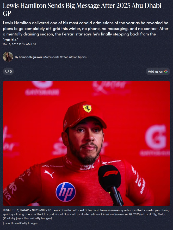 romankimberly+FollowHamilton Unplugs After Ferrari PressureWow, King Lewis is really making a statement after his first season in red! After all the hype and scrutiny around his Ferrari debut, he’s going totally off the grid this winter—no phone, no socials, just pure reset mode. Honestly, can you blame him? The pressure was next level this year. Let’s hope this break gives him the edge for 2026. What do you think—will this digital detox pay off for the champ? #Sports #Racing #F100Share