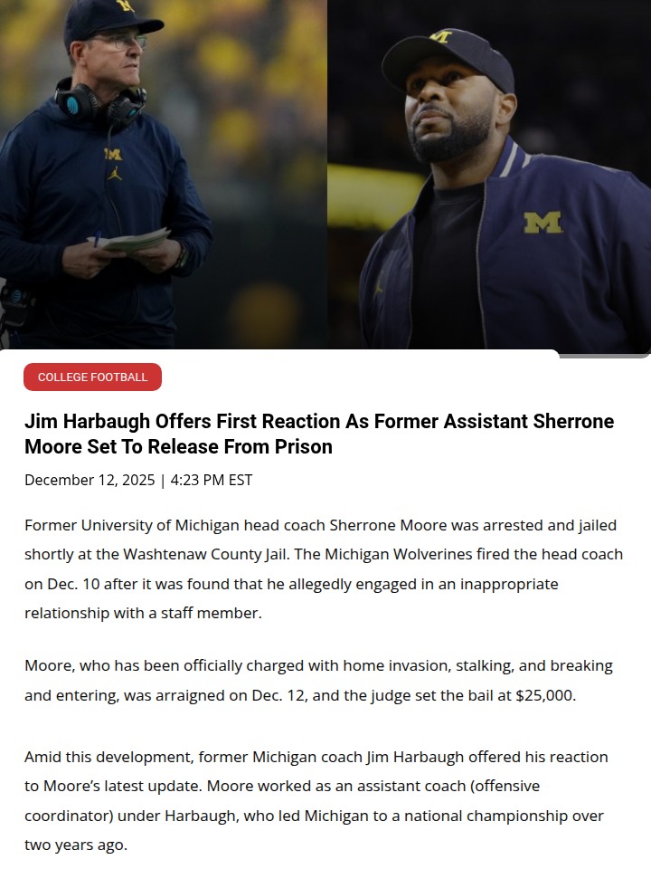 glen25+FollowSherrone Moore’s arrest shakes Michigan footballSherrone Moore, once seen as a rising star for Michigan football, is now facing serious charges including home invasion and stalking after a troubling incident involving a former partner. The university acted fast, firing Moore and launching an internal investigation, with interim president Grasso stressing zero tolerance for such behavior. Jim Harbaugh, Moore’s former boss, admitted he’s still processing the news—echoing the shock felt by many in the community. With Moore’s next court date set for January, Michigan fans are left wondering how this will impact the team’s future and reputation. What’s your take on the university’s response? #Sports #Football #MichiganFootball00Share