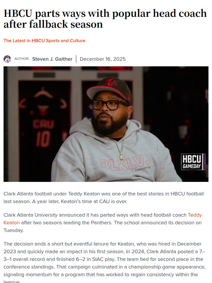 Chad Williams+FollowClark Atlanta football shakes up coaching staffClark Atlanta football is heading in a new direction after parting ways with head coach Teddy Keaton, just a season after a remarkable turnaround. Keaton’s first year brought the Panthers to a championship game and renewed hope for the program, but a tough follow-up season led to his exit. This move puts Clark Atlanta among several HBCUs now searching for new leadership amid changing conference dynamics and resource challenges. It’s a reminder of how quickly fortunes can shift in college sports. What do you think the Panthers need most in their next coach to build lasting success? #Sports #Football #ClarkAtlanta00Share