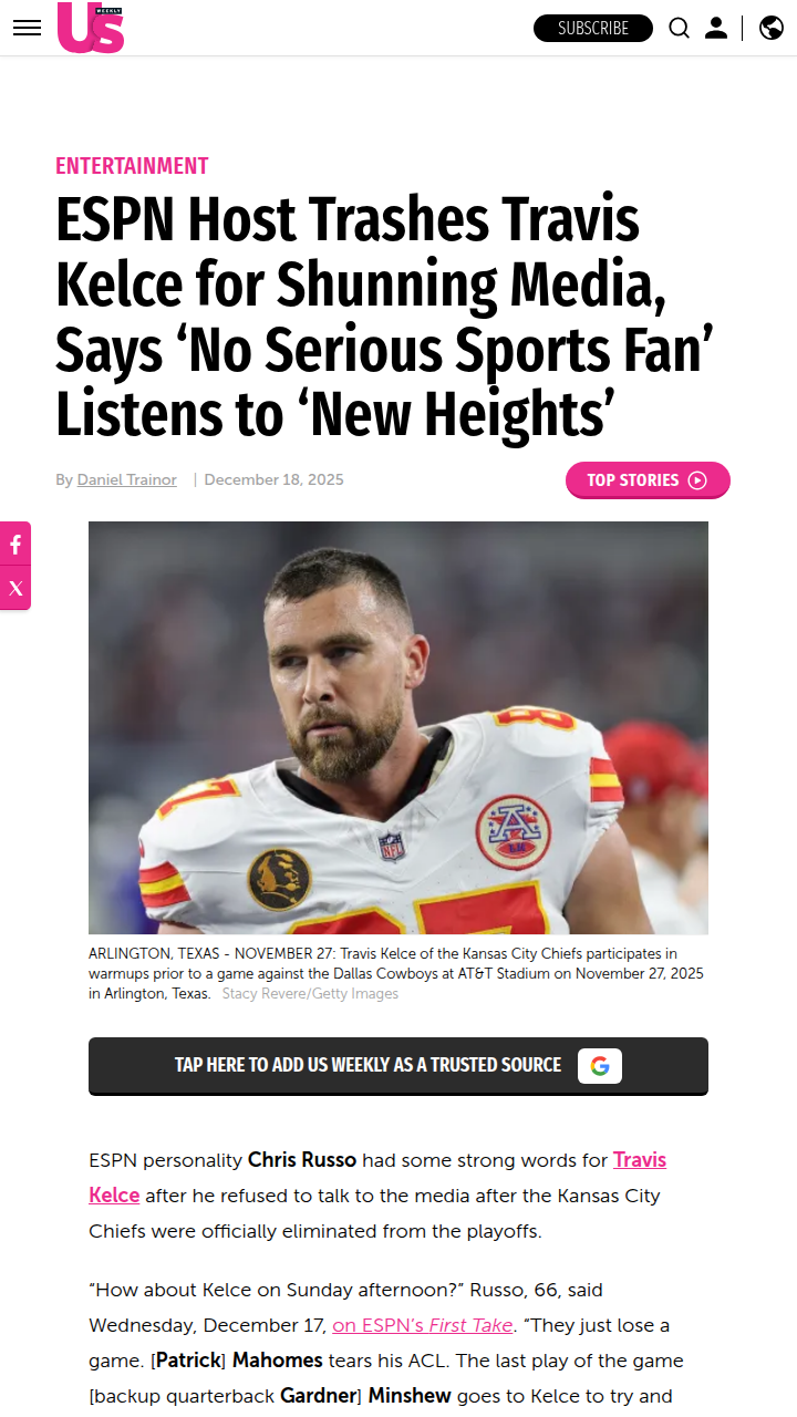 Michael Pitts+FollowKelce’s Silent Exit: Chiefs-Chargers FalloutWild finish in Chiefs-Chargers, but the big talk isn’t just Mahomes’ injury or that last-play pick—it's how Big Yeti (Kelce) ghosted the media after KC’s playoff hopes died. Chris Russo roasted him on ESPN, saying Chiefs fans deserved a few words. Instead, Kelce saved his thoughts for “New Heights.” Is this a new era for player-fan communication, or did he owe us more in the moment? #Sports #Football #ChiefsKingdom00Share