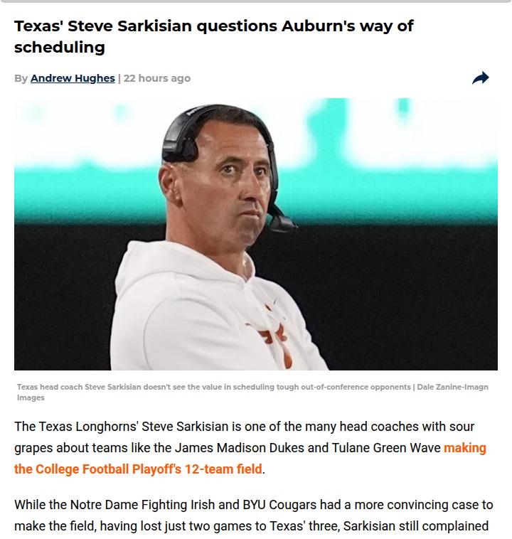 Michael Pitts+FollowTexas coach calls out CFP, Auburn doubles downSteve Sarkisian isn’t holding back—he’s frustrated that teams with easier schedules are making the College Football Playoff over those who take on tougher opponents. Meanwhile, Auburn’s leadership is doing the opposite: they’re stacking their future schedules with powerhouse matchups against Baylor, Notre Dame, and Miami, even if fans aren’t thrilled. It’s a bold move that’s all about challenging the best, not playing it safe. Do you think strength of schedule should matter more, or is it all about the win-loss record? Let’s hear your take! #Sports #Football #CollegeFootball00Share