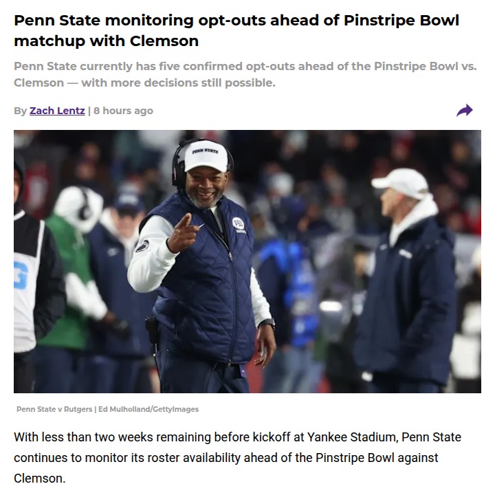 Jay Williams+FollowPenn State’s Pinstripe Bowl roster shakeupPenn State fans, the lineup for the Pinstripe Bowl against Clemson is getting interesting. Five Nittany Lions have already opted out, including star running back Nick Singleton and All-American guard Vega Ioane, and more could follow as game day approaches. Clemson’s situation is even wilder—27 players out, including eight starters! With so many changes, this matchup at Yankee Stadium is shaping up to be a true test of depth and adaptability. How do you think these roster moves will impact the game? Will the young talent step up under the bright lights? #Sports #Football #PennState00Share