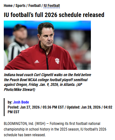Jay Williams+FollowIU football’s 2026 schedule is here!IU fans, get ready—after clinching their first-ever national championship in 2025, the Hoosiers just dropped their full 2026 football schedule! There’s a mix of familiar rivals and some fresh matchups, including first-time games under Coach Cignetti against Rutgers, Minnesota, and USC. With Cignetti boasting a 27-2 record in Bloomington, expectations are sky-high. Circle your calendars for big home games against Ohio State and Purdue, plus a November showdown with USC. Which matchup are you most excited for, and how do you think IU will handle the pressure as defending champs? #Sports #Football #IUFootball10Share
