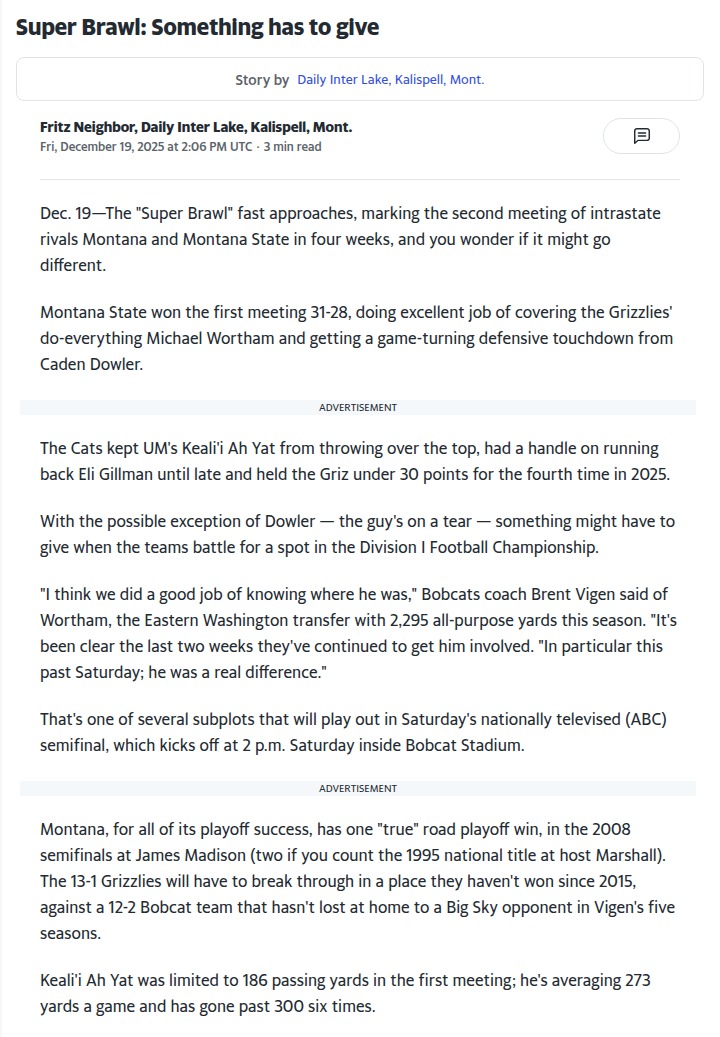 Chad Williams+FollowMontana’s Super Brawl showdown: Who breaks the streak?Montana and Montana State are set for a fierce rematch with everything on the line—bragging rights, a championship shot, and a chance to break some serious streaks. The Bobcats haven’t lost at home to a Big Sky rival in five years, but the Grizzlies are on fire, racking up over 50 points in each playoff game. With Michael Wortham making defenders miss and both teams’ defenses clashing in style, Saturday’s game in Bozeman could be a classic. Can Montana finally win on the road, or will MSU’s home dominance continue? Let’s hear your predictions! #Sports #Football #MontanaFootball00Share