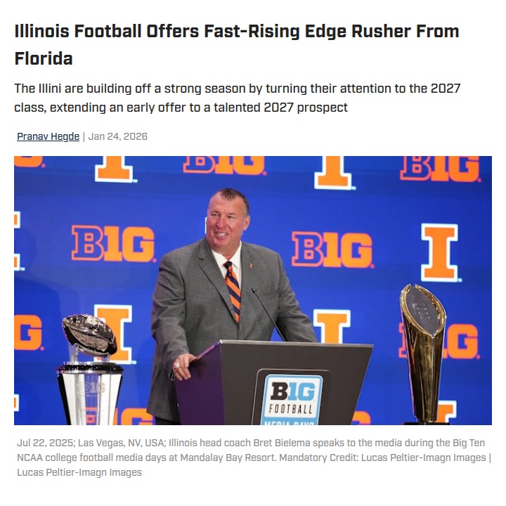 glen25+FollowIllini Strike Early for Florida Edge StarBig news for the Illini faithful—Coach Bielema is keeping the recruiting pedal down by offering Wilzard Sterling, a fast-rising edge rusher from Boca Raton, FL. Sterling’s explosive play at recent tournaments has drawn national attention, but Illinois is the first Power 4 to make a move. With NC State and USF now circling, can the Illini’s Florida pipeline and recent on-field success win this recruiting battle? #Sports #Football #Illini00Share