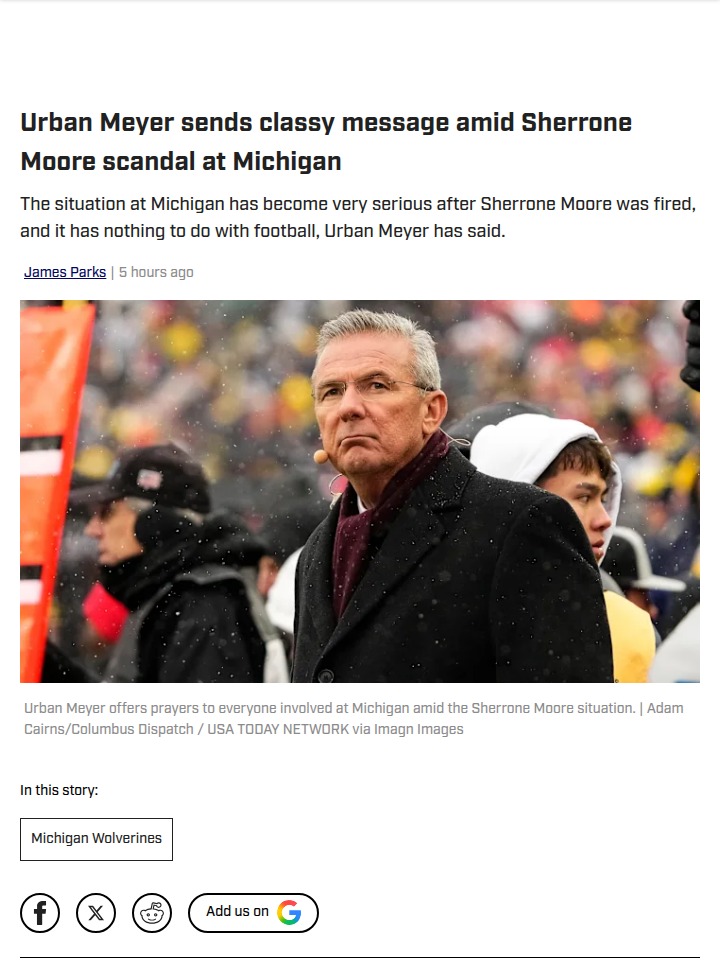 John Camacho+FollowUrban Meyer’s Classy Take on Moore ScandalRivalry aside, Urban Meyer showed real class after the shocking Sherrone Moore scandal at Michigan. The former Buckeyes coach made it clear that football is the last thing on his mind, offering prayers for Moore’s family after the coach’s firing and subsequent arrest. Meyer’s focus on the human side—especially Moore’s kids—reminds us some things are bigger than the Game. Thoughts? #Sports #Football #UrbanMeyer20Share
