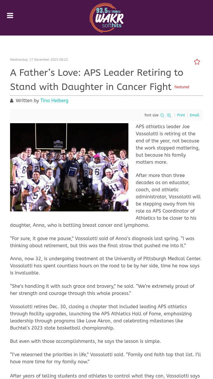 Erica Martinez MD+FollowAkron coach retires to support daughter’s cancer fightJoe Vassalotti, a familiar face in Akron’s athletic scene, is stepping away from his role as APS Coordinator of Athletics—not for a new job, but to stand by his daughter Anna as she battles both breast cancer and lymphoma. After years of late nights and weekends dedicated to students and athletes, Vassalotti says it’s time to put family first. His story is a powerful reminder of what truly matters, and how life can shift our priorities in an instant. How do you balance work, passion, and family when life throws you a curveball? #News #Akron #FamilyFirst00Share