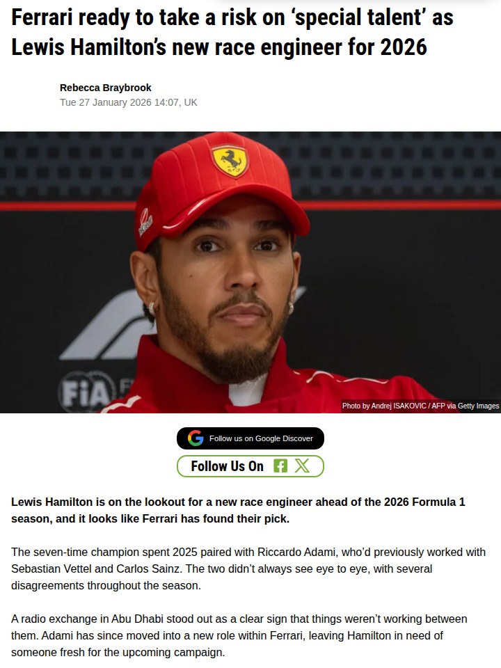 Jeremy Campbell+FollowFerrari’s Gamble: New Engineer for King LewisBig news from Maranello—Ferrari is taking a bold step by bringing in Cedric-Michel Grosjean, the highly-rated ex-McLaren man, as King Lewis Hamilton’s new race engineer for 2026. After a rocky 2025 with Adami (remember that tense Abu Dhabi radio?), the Scuderia is betting on Grosjean’s fresh perspective, even though he’s never held the top engineering job in F1. Could this be the spark Hamilton needs to bounce back? Let’s hear your takes! #Sports #Racing #Ferrari10Share
