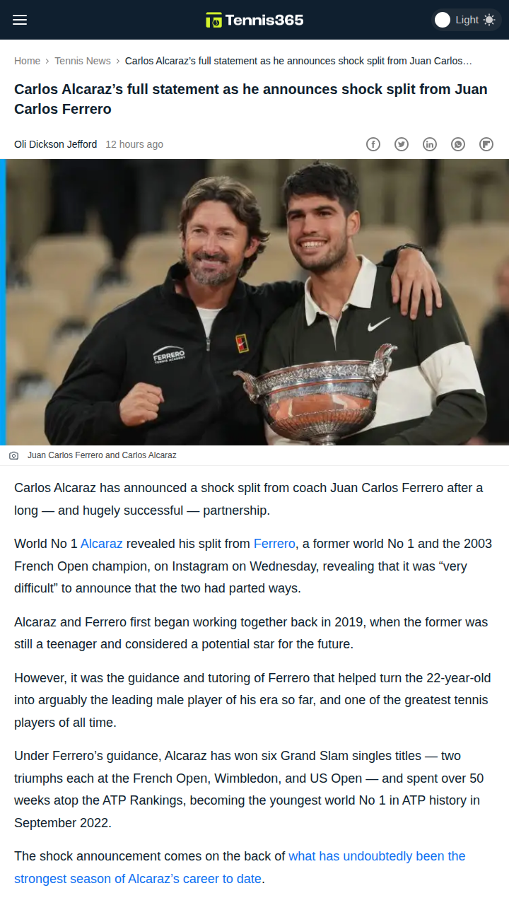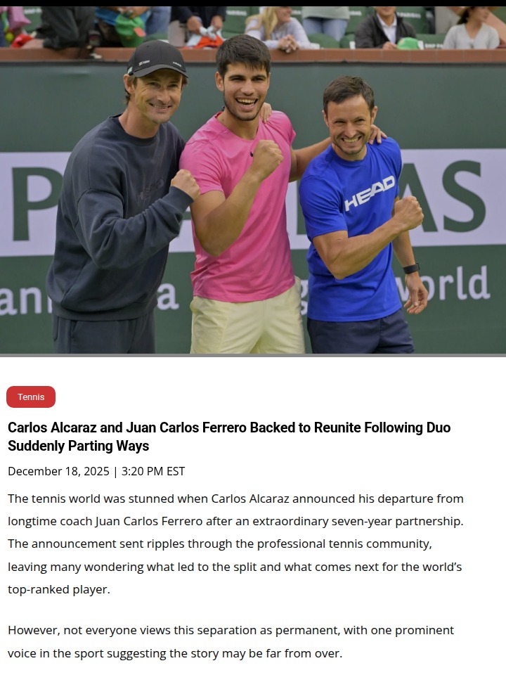 davidsonbrandon+FollowAlcaraz & Juanki: End of an EraWow, tennis fans—did anyone see this coming? Carlitos just dropped a bombshell on IG, announcing he and Juanki (Juan Carlos Ferrero) are parting ways after a legendary run. From teenage prodigy to World No. 1 and six Slams, Ferrero’s been the mastermind behind Alcaraz’s rise. Hard to imagine the Chosen One without his mentor, especially after a near-perfect 2025. What’s next for both? Who should Alcaraz team up with now? #Sports #Alcaraz #Ferrero00Share