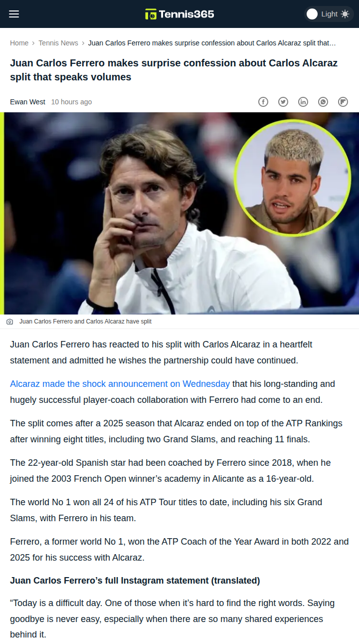 Jenna Gonzales+FollowFerrero’s Honest Words on Alcaraz SplitWow, didn’t see this coming! Juan Carlos Ferrero just opened up about his split with Carlitos, and it sounds like it wasn’t his call. After a record-breaking 2025 season where Alcaraz looked nearly unbeatable, Ferrero’s statement—especially “I wish I could have continued”—hints the world No. 1 made the decision. This is huge for Spanish tennis. Do you think this changes Alcaraz’s dominance or is he still the guy to beat? #Sports #Alcaraz #Ferrero00Share