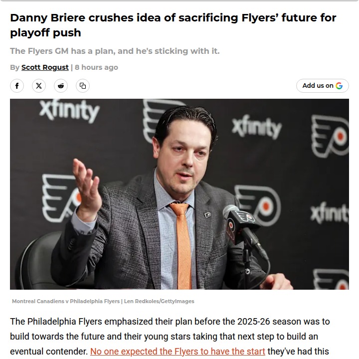Sherri West+FollowFlyers fans: No quick fixes, future first!The Flyers are riding high this season, but GM Danny Briere is making it clear—no blockbuster trades just for a playoff push. Even with the team sitting third in the Metro and surprising everyone, Briere says the plan is to keep building for the long haul. No sacrificing young talent or draft picks for a rental. It’s all about giving the next generation of Flyers a shot to grow and compete. What do you think—should the Flyers stay patient, or go all-in while they’re hot? #Sports #IceHockey #Flyers00Share