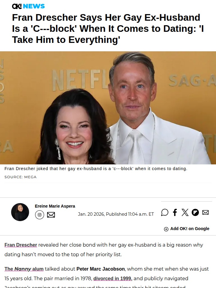 Dominique Hoffman+FollowFran Drescher’s Ex Is Her Ultimate Wingman (Sorta)Fran Drescher says her gay ex-husband, Peter Marc Jacobson, is basically blocking her from finding new love—and she’s not mad about it! After 24 years divorced, Fran calls Peter her soulmate and plus-one for everything, so dating feels unnecessary. She’s all about friends with benefits, but a serious relationship? Not happening. Fran’s living her best life with her BFF ex, and honestly, who can compete with that history? #Relationships #FranDrescher #TheNanny00Share