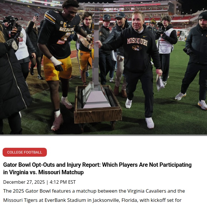 glen25+FollowGator Bowl Showdown: Cavs vs Tigers HistoryAll eyes are on the TaxSlayer Gator Bowl as the Wahoos and Mizzou Tigers clash for just the second time ever. Virginia’s record-setting season could end with a historic 11th win, but Mizzou’s defensive stars and ground game are a real threat. With King Taylor leading UVA and Hardy powering Mizzou, who takes the edge in this rare ACC-SEC battle? Let’s hear your predictions! #Sports #Football #GatorBowl00Share