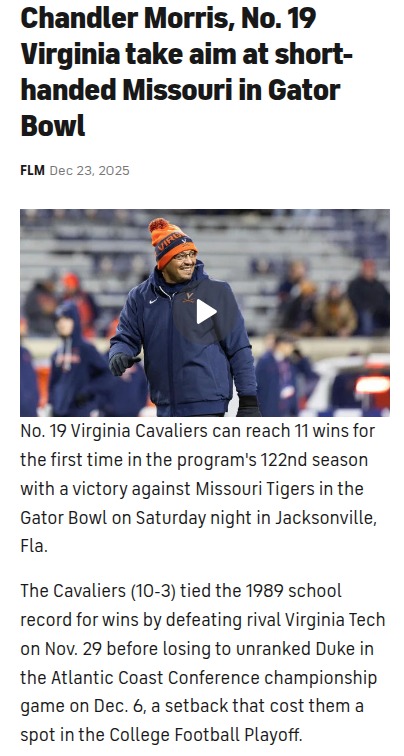 Jeffrey Armstrong+FollowCavs Chase History vs Short-Handed MizzouHoos fans, are we about to witness history? The Wahoos are one win away from their first-ever 11-win season, but the Gator Bowl matchup gets spicy: Missouri’s rolling out a true frosh QB and missing key receivers, while Chandler Morris—on his fourth college stop—could be suiting up for the last time. Can the Cavs’ D line shut down SEC rushing king Ahmad Hardy? This one’s got all the drama! #Sports #Football #GatorBowl00Share