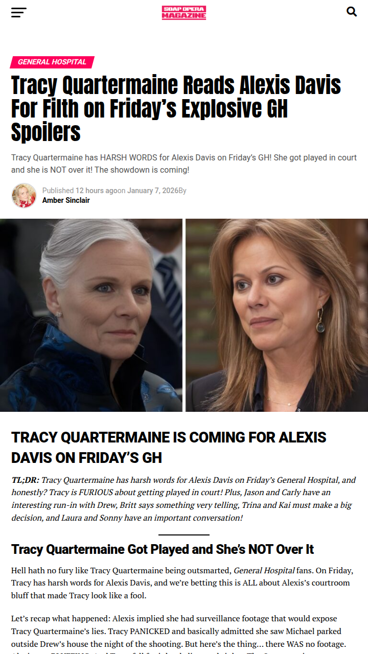 Cathy Porter+FollowTracy Quartermaine vs Alexis Davis 💥Tracy Quartermaine absolutely lost it on Alexis Davis after being outsmarted in court on Friday’s General Hospital! Tracy thought Alexis had surveillance footage exposing her, but it was all a bluff—Tracy totally fell for it and now she’s furious. Fans are split: is Tracy right to be mad, or did Alexis just play the game better? The courtroom drama is next-level, and everyone’s talking about who really won this round! #Entertainment #TVSeries #GeneralHospital50Share