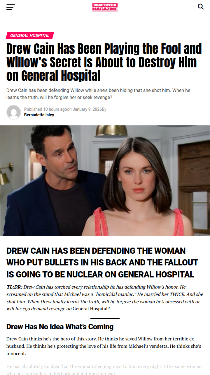 Ryan Massey+FollowGeneral Hospital’s wildest secret is about to explodeDrew Cain has risked everything for Willow—his reputation, his family, even his dignity. But he’s about to learn the truth: the woman he’s obsessed with is the same one who shot him and left him for dead. When this secret finally comes out, Port Charles is in for chaos. Will Drew forgive Willow, seek revenge, cover it up, or use it as leverage? No matter what, Michael’s been right all along, and that’s going to sting. What would you do if you were in Drew’s shoes? Let’s talk about it! #Entertainment #TVSeries #GeneralHospital140Share