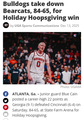 EchoingEagle+FollowBulldogs rally for biggest neutral win since 2001Georgia fans just watched the Bulldogs flip the script in Atlanta, storming back from an 11-point deficit to dominate Cincinnati 84-65 at Holiday Hoopsgiving. Blue Cain exploded for a career-high 22 points, and the Dawgs’ deep bench kept the energy high all game. What’s wild is this is Georgia’s largest neutral-site win in over 20 years! The team’s hustle on rebounds and smart passing down the stretch made all the difference. Anyone else feel like this squad is finding its groove at just the right time? Let’s talk: how far can this team go if they keep up this momentum? #Sports #GoDawgs #GeorgiaBasketball00Share