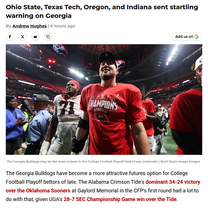 Chad Williams+FollowDawgs Send a Message: Georgia's CFP EdgeBulldog Nation, are we looking at a new top dog in the CFP? After that SEC title beatdown, Georgia’s defense is looking next-level, and Gunner Stockton keeps coming up clutch. Meanwhile, the Buckeyes are dealing with the Brian Hartline play-calling drama—could that shakeup cost them? With the Dawgs’ odds looking better than ever, it feels like UGA is the team to watch. Thoughts on whether the Dawgs can keep this momentum rolling? #Sports #Football #GeorgiaBulldogs00Share