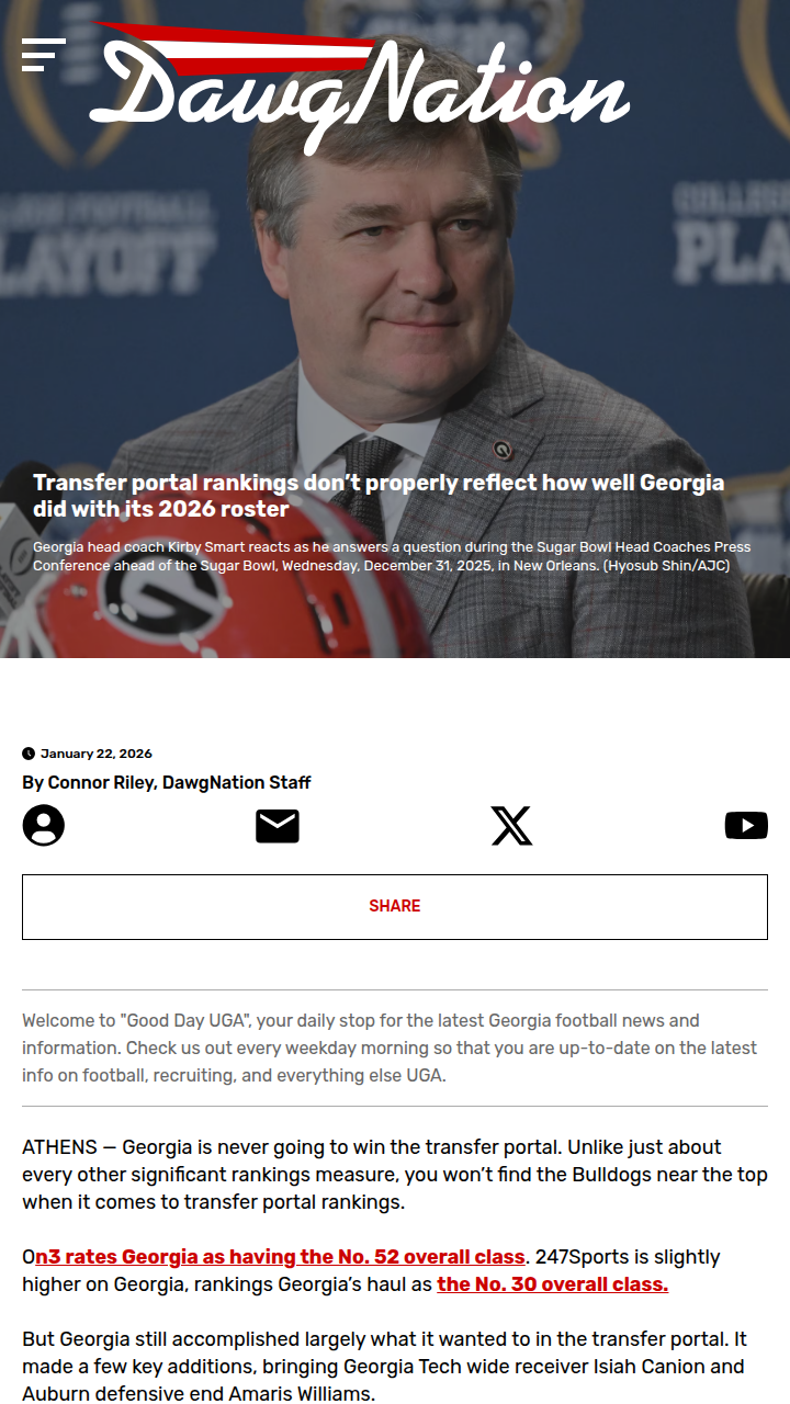 Jeffrey Armstrong+FollowGeorgia’s transfer portal strategy pays offGeorgia’s approach to the transfer portal this year is all about keeping the core team together and betting on quality over quantity. While national rankings don’t show the Bulldogs near the top, they managed to keep most of their key players, add a few targeted transfers, and avoid the mass departures seen at other SEC schools. The real win? Stability and depth, especially at linebacker and quarterback, setting Georgia up for a strong 2026 season. What do you think—does keeping the roster intact matter more than flashy transfer additions? #Sports #Football #GeorgiaFootball00Share
