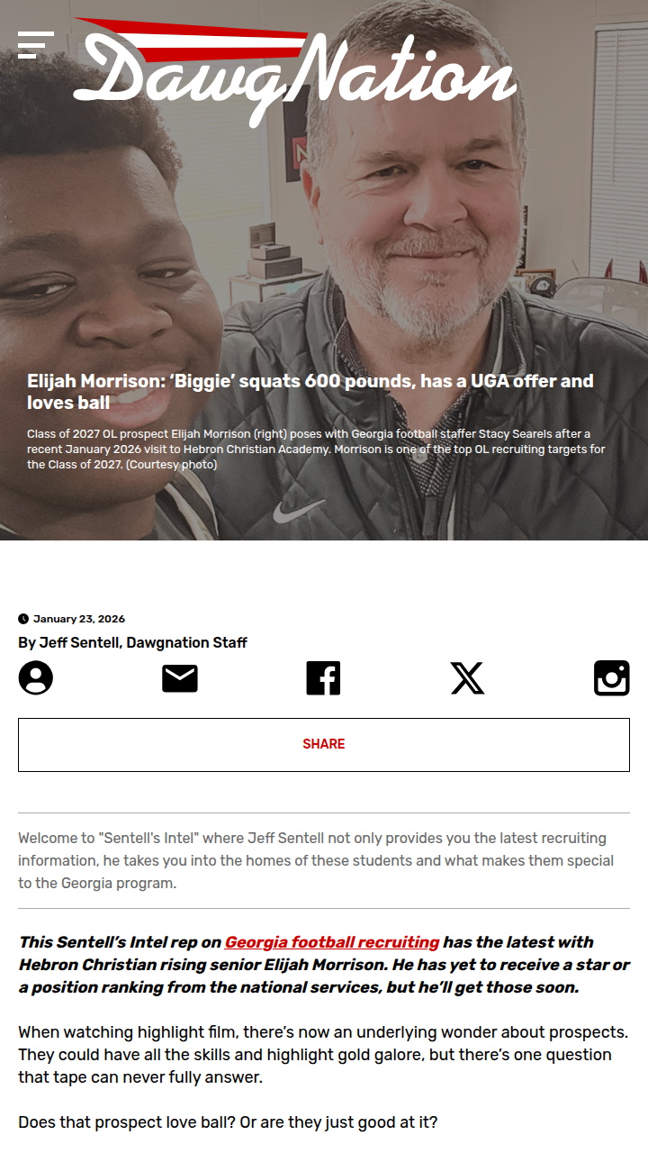 Jay Williams+FollowGeorgia’s top safety prospect in the spotlightGiovanni Tuggle, the nation’s No. 1 safety for 2028, is getting serious attention from Georgia—and it’s personal. Coach Kirby Smart recently visited Tuggle at his school in Winder, showing he’s invested in Tuggle’s future both on and off the field. Tuggle’s impressed by how Smart develops safeties and gets them to the NFL, especially since Smart played the position himself. With Power Five offers piling up, Tuggle’s keeping an eye on relationships and development. What do you think matters most for a young athlete choosing a college—coaching, development, or something else? #Sports #Football #GeorgiaFootball00Share