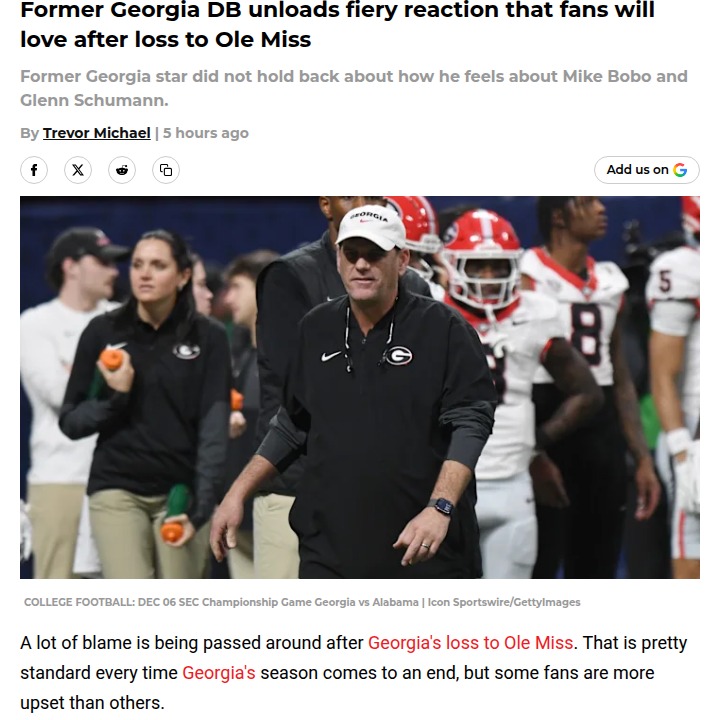 Amy Williams+FollowGeorgia fans divided after Ole Miss lossCorey Moore, a former Georgia defensive back, isn’t holding back after the Bulldogs’ tough loss to Ole Miss. He’s doubling down on his earlier call for a coaching shakeup, saying as long as Mike Bobo and Glenn Schumann are running the offense and defense, Georgia won’t win another national title. Moore insists it’s not just frustration talking—he’s drawing on his experience as a player and what he sees on the field. With Kirby Smart still backing his coordinators, it’s sparking big debate: Should Georgia make a change, or stick with what’s worked before? #Sports #Football #GeorgiaFootball00Share
