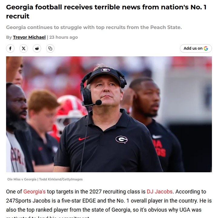 Aaron Taylor+FollowGeorgia football loses top recruit to Ohio StateLosing DJ Jacobs, the nation’s No. 1 recruit and Georgia’s own homegrown star, to Ohio State is a tough blow for UGA fans. That’s now two years in a row the Bulldogs have missed out on the state’s top player, raising real questions about Kirby Smart’s ability to keep elite talent at home. While Georgia’s 2027 class is still strong, missing out on Jacobs stings—especially when he was right in their backyard. What do you think is behind this trend, and how can UGA turn it around? Let’s hear your thoughts! #Sports #Football #GeorgiaFootball00Share
