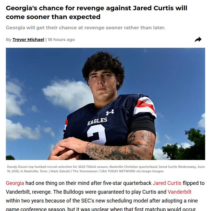 glen25+FollowGeorgia fans, circle October 5 for Curtis showdownGeorgia’s shot at payback against former recruit Jared Curtis and Vanderbilt is coming way sooner than expected. The SEC just dropped the 2026 schedule, and the Bulldogs will face Curtis and the Commodores in Athens on October 5—week five! After Curtis flipped his commitment to Vanderbilt, this matchup has been the talk of Athens. Now, with the game set early in the season and at home, emotions are sure to run high. Will Curtis live up to the hype, or will Georgia make a statement? This one’s definitely circled on every Dawg fan’s calendar. #Sports #Football #GeorgiaFootball00Share