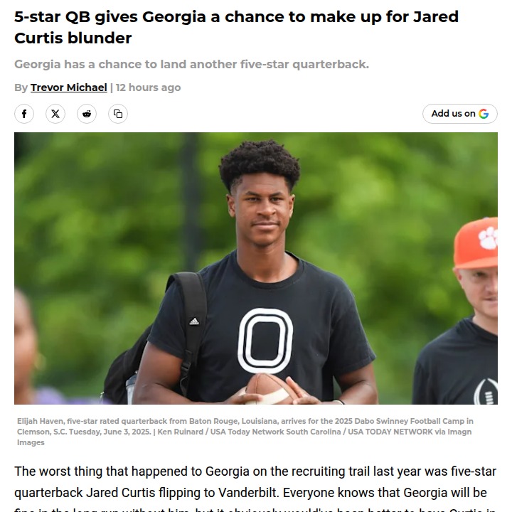 John Camacho+FollowGeorgia’s QB future just got a major twistLosing five-star QB Jared Curtis to Vanderbilt stung for Georgia, but it might have opened the door to something even bigger. Now, the Bulldogs are in the top four for Elijah Haven—the No. 1 quarterback in the 2027 class. With Curtis out of the picture, Haven is seriously considering Georgia, and that could totally reshape the team’s future. Plus, UGA is already in a strong spot with other top QB recruits. If Haven picks Georgia, it could be a game-changer. What do you think—will Georgia land their next star QB? #Sports #Football #GeorgiaFootball00Share