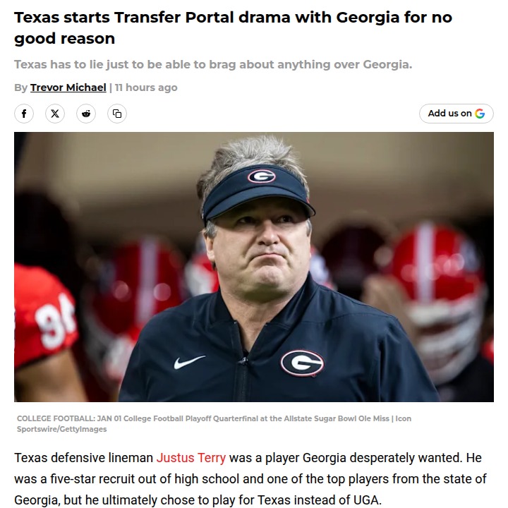 Chad Williams+FollowGeorgia vs Texas: Transfer Portal rivalry heats upTexas fans are stirring the pot, claiming Georgia is desperate to land Justus Terry through the Transfer Portal—but folks in Athens aren’t buying it. Sure, Terry’s a top talent, but Georgia’s already proven themselves against Texas, beating them three times in two seasons, including a blowout in Athens and a win in the SEC Championship. The real story? Texas might be feeling the pressure after joining the SEC and not dominating as expected. What do you think—are these transfer rumors just Texas trying to save face, or is there more to it? #Sports #Football #GeorgiaFootball00Share