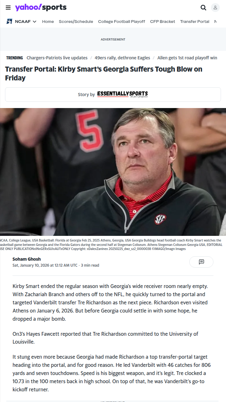 glen25+FollowDawgs Miss Out on Speedster Tre RichardsonTough news for Dawg Nation—Kirby Smart and the crew just lost out on their top portal target, Tre Richardson, to Louisville. The Vandy burner, who racked up 1,295 all-purpose yards last season, was supposed to help fill the void left by Zachariah Branch. With Gunner Stockton losing his go-to guy, Georgia’s WR room is still searching for proven playmakers. Can Isiah Canion or Talyn Taylor step up next year? Let’s hear your takes! #Sports #Football #GeorgiaFootball00Share