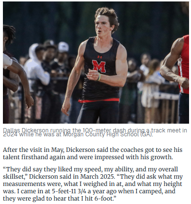 Aaron Taylor+FollowGeorgia lands blazing-fast WR Dallas DickersonGeorgia just scored a major win on the recruiting trail by landing Dallas Dickerson, a North Oconee wide receiver known for his game-changing speed. After a whirlwind year—including a commitment to Kentucky and a coaching shakeup—Dickerson chose the Bulldogs over big names like Florida and Ole Miss. His 100-meter dash time? A lightning-quick 10.38 seconds. He’s already helped North Oconee to a state title and joins a growing list of Titans making waves in Athens. With his speed and skillset, Dickerson could be a difference-maker for Georgia’s offense. What do you think this means for the Bulldogs’ future? #Sports #Football #GeorgiaFootball00Share