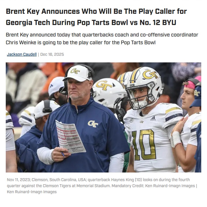 Aaron Taylor+FollowGeorgia Tech’s new play caller for Pop-Tarts BowlChris Weinke is stepping up as Georgia Tech’s offensive play caller for the Pop-Tarts Bowl against BYU, following Buster Faulkner’s departure to Florida. Despite the shake-up, Coach Brent Key says the team isn’t distracted—everyone’s focused on game prep and keeping things business as usual. With Weinke’s strong track record coaching Haynes King, there’s a sense of confidence among the Yellow Jackets. How do you think this leadership change will impact Georgia Tech’s performance against a tough BYU squad? Let’s hear your thoughts on how coaching changes shape a team’s bowl game energy! #Sports #Football #GeorgiaTech00Share