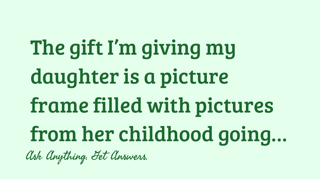 The gift I’m giving my daughter is a picture frame filled with pictures from her childhood going into her early adulthood. The pictures will be laid out in a silhouette of me and her with it leading up to the hands being me and her. (As if we’re hugging each other 😊)  #GiftImGiving