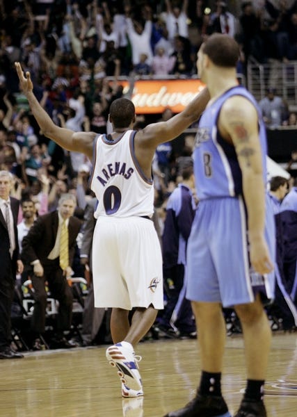 Pamela Owens+FollowHow good was Gilbert Arenas in his prime? Before the injuries and the locker room incident, Agent Zero was a walking bucket. From 2005 to 2007, Arenas averaged 28.3 PPG, 5.4 APG, 4.6 RPG, and shot nearly 36% from deep — including a 60-point masterpiece against Kobe’s Lakers. He was feared, clutch, and could drop 40 on anyone, anytime. He wasn’t just flash either — he led the Wizards to three straight playoff appearances and was one of the most electric guards in the league before his body gave out. Was Gilbert underrated or properly rated for his short but explosive prime? #NBA #GilbertArenas #AgentZero #Wizards #NBALegends #NBATalk70Share